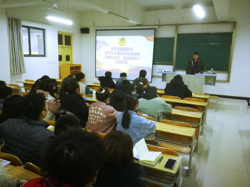 为深入学习贯彻党的十九届五中全会精神,12月15日,澳门十大信誉好的网站党总支书记张纪生以“青春心向党,奋进新时代”为题,为十大信誉官网团员上了一堂生动的团课。各班团支书、班长、宣传委员和组织委员参加了团课学习。