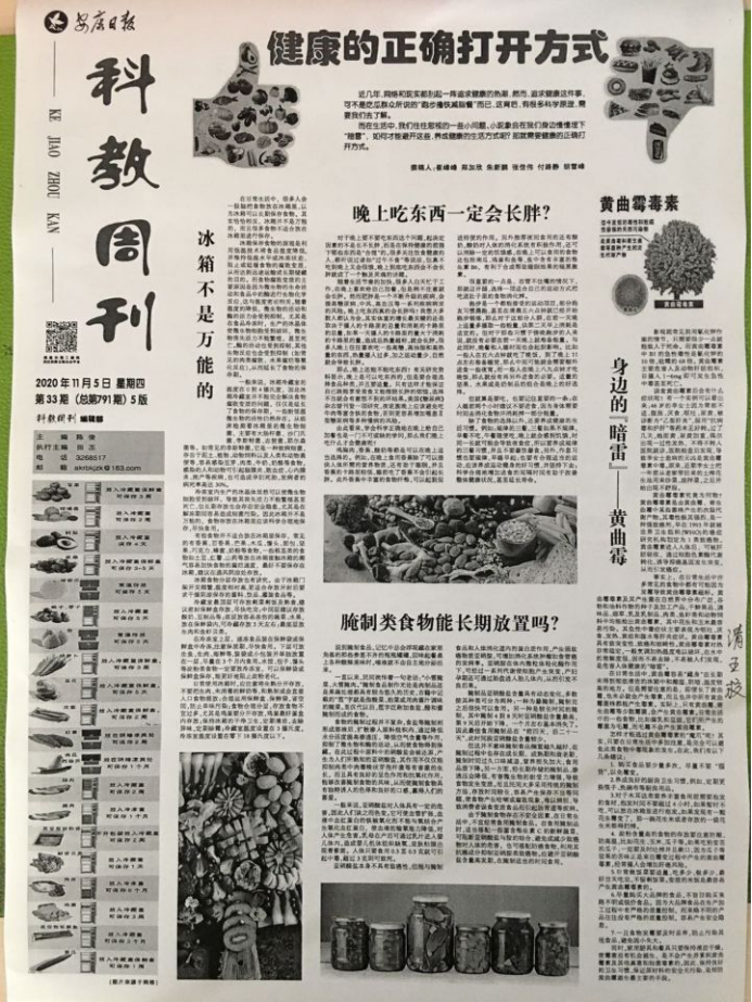 由朱新鹏、付路静老师指导,十大信誉官网食品科学与工程2018级学生郑加欣撰写的“腌制类食物能长期放置吗?”、张佳伟撰写的“晚上吃东西一定会长胖?”、胡雪峰撰写的“身边的‘暗雷’——黄曲霉”三篇科普文章,在11月5日出版的安康日报科教周刊刊出。三篇文章分别从腌制类食物的安全性、存放期间的变化和科学食用,一日三餐的合理搭配和晚上可食用的食物类别,黄曲霉毒素的危害和日常生活如何避免其影响等方面,给消费者提出了很好的建议。学生通过发表文章,在服务社会的同时,也锻炼了写作能力,提高自信心,充分认识到本专业在为人民美好生活服务上的作用,为今后的学习增添动力。