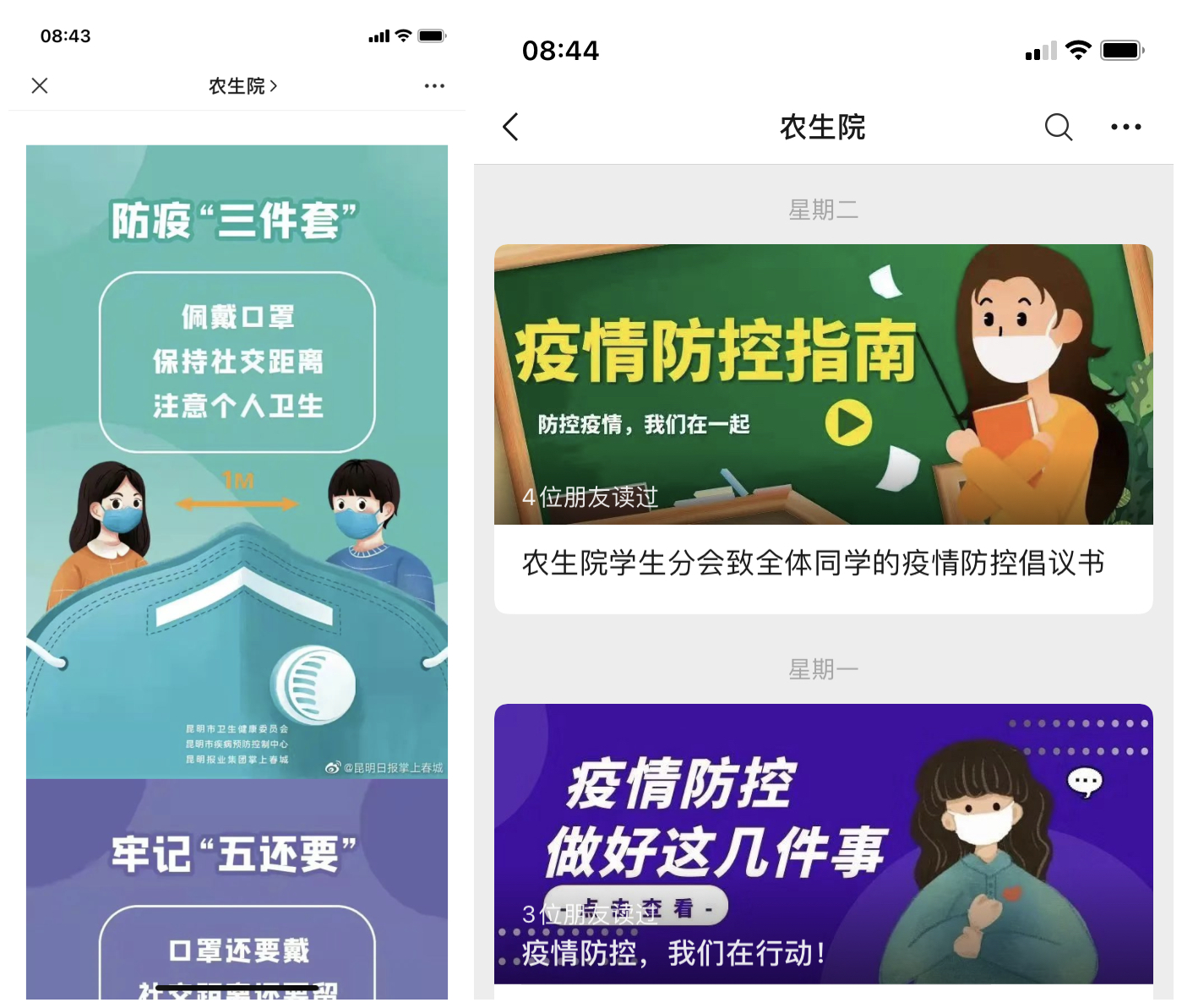 团总支、学生会充分发挥官方媒体平台、微信公众号等新媒体宣传阵地,广泛宣传新冠肺炎等重点传染病防控相关知识,积极引导学生正确认识疾病,科学自我防护,营造了爱国卫生人人受益、疫情防控人人有责、健康生活人人共享的健康氛围。