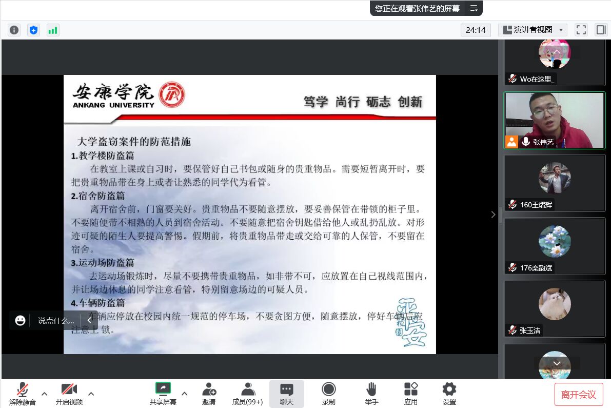 为深入扎实做好新生入学安全教育工作,近日,澳门十大信誉好的网站学工办主任谭自力、2022级辅导员张伟艺老师利用网络平台在线上为新生做安全教育讲座。