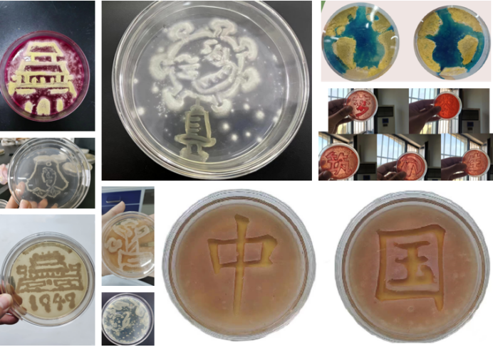 2021级生物技术班学生从环境中自行筛选菌种,精心设计,分别选取雷锋、天安门、中华、华表、玉兔、抗疫等竞赛主题,以培养皿作画板,接种环作画笔,微生物做“颜料”,持续两周的时间,完成一幅幅精美的艺术作品。在现场各组参赛学生对作品进行完美地展示,依次进行微生物知识问答、抢答。