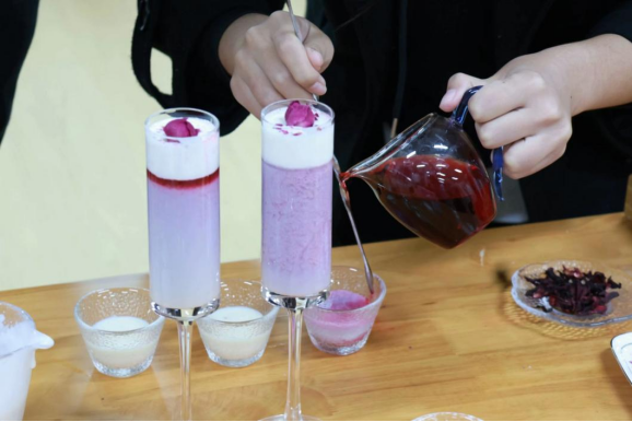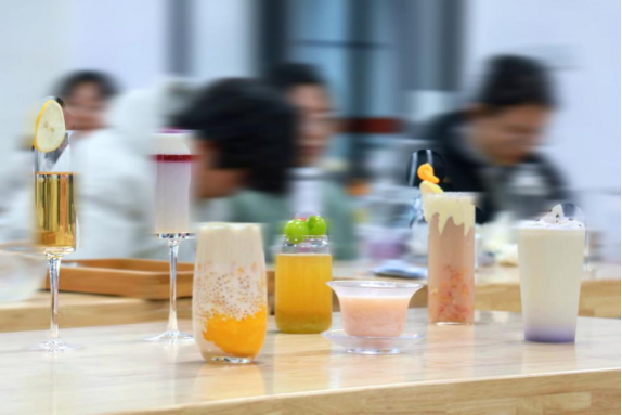 比赛现场,学生们精心准备了各种茶叶和配料,通过巧妙的搭配和调试,制作出了一杯杯色香味俱佳的调饮茶作品。