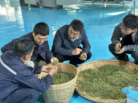 在山川秀美农业有限公司茶叶生产车间,专业教师结合生产实际为企业技术负责人详细讲解了绿茶香气形成阶段中鲜叶原料摊放和杀青的最适状态,建议对加工工艺参数进行优化调整,在鲜叶采摘前对采茶人员进行培训,以提高鲜叶的嫩度、匀度和新鲜度,为高品质明前绿茶生产奠定基础。