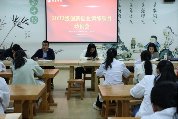 为切实将创新创业教育融入人才培养全过程,培养学生创新思维、创新意识和勇于探索的精神,4月9日下午于江北校区茶艺室召开2024年大学生创新创业训练项目申报动员会,会议由茶学系主任李冬花主持,茶学系教师齐玉岗、吴冲、袁月、常娜、尹旭超以及2022级全体学生参加。