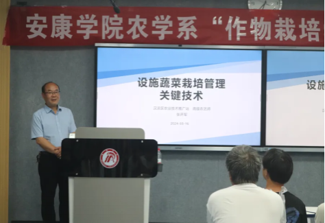 5月16日,农学系在江北1208教室开展了农学专业《作物栽培学》双师课程教学活动。此次活动邀请了汉滨区农业技术推广站高级农艺师张开军为农学22级同学讲授“设施蔬菜栽培管理关键技术”的专题。