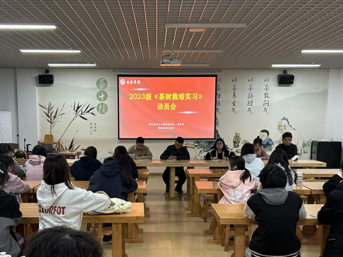 10月20日下午,2023级茶学茶树栽培实习动员会在产教融合大楼茶艺室召开。茶学系主任李冬花,专业教师齐玉岗、吴冲、常娜、尹旭超及2023级茶学专业全体学生参会。
