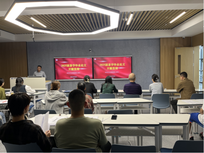 10月10日下午,在乡村振兴大楼培训研讨教室开展了2025届茶学专业毕业论文开题答辩,茶学系教师李冬花、谢满超、齐玉岗、马瑛、程晓梅、吴冲、袁月、常娜、贺心茹和尹旭超以及2021级茶学专业全体学生参加了此次汇报,会议由齐玉岗老师主持。