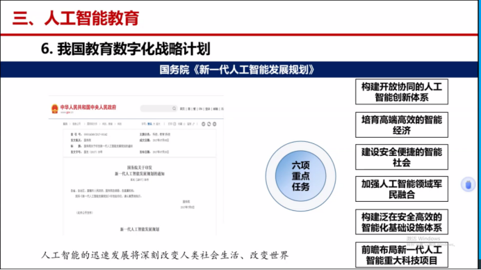 在专业体系建设方面,专家详细介绍了人工智能体系化人才培养的顶层设计,包括国家智慧教育平台的资源整合与国际化发展。课程教材模块则重点探讨了“人工智能+”课程体系的构建,以及高质量教材的数字化转型,强调集成化、智能化和国际化的编写理念。应用场景部分展示了AI在高校教学、科研、管理及服务中的实际案例,如智能助教、虚拟仿真实验室和个性化学习系统等。产教融合环节分享了江苏省“AI教育创新联合体”的实践经验,强调校企协同育人的重要性。国际合作模块则通过“数字丝绸之路”教育行动案例,展现了AI技术在全球教育资源共享中的推动作用。