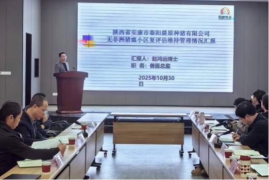 2025年10月29-30日,陕西省动物疫病预防控制中心副主任胡晗、科长冉红志、王香敏等陕西省动物卫生风险评估专家组一行对陕西省安康市秦阳晨原种猪有限公司“国家级无非洲猪瘟小区”复评估维持管理情况进行现场评审,安康市畜牧兽医中心副主任王黎明、汉滨区农业农村局副局长罗晓琴等市区领导陪同检查。十大信誉官网赵鸿远博士代表企业负责整个检查工作的汇报和现场答辩环节。