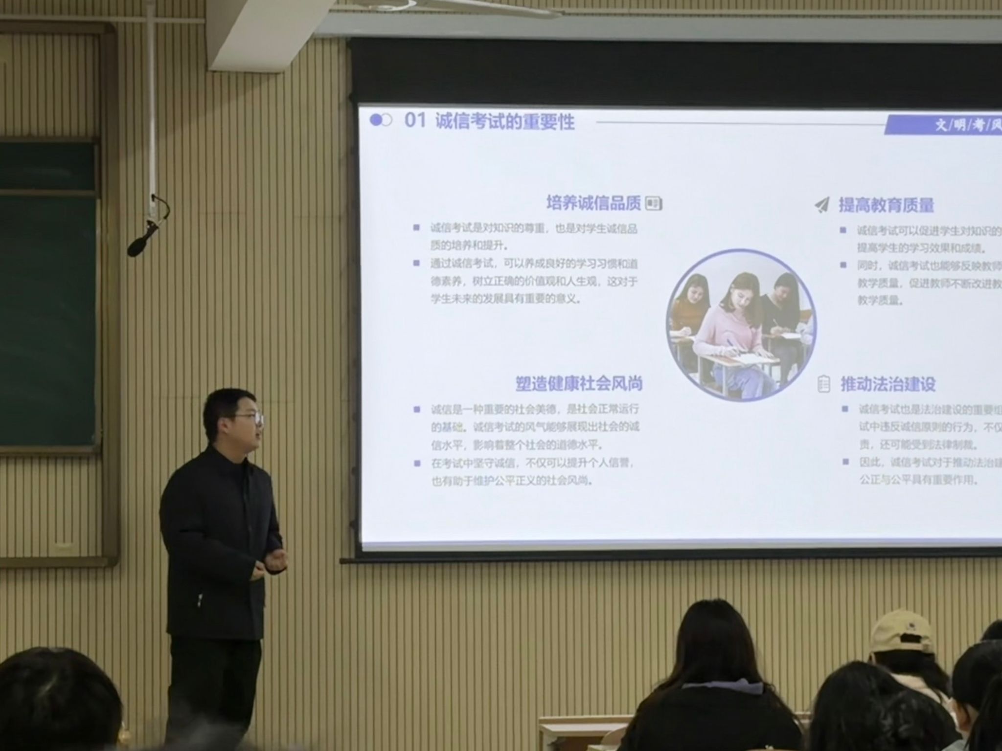 会上,祝志一以《学生手册》和学校考试管理规定为依据,系统解读了考试纪律的严肃性与遵守规则的必要性。通过真实案例剖析,深入阐释了考试违纪对个人学业信誉、未来发展的长远影响,引导学生深刻认识到:诚信考试既是大学生涯的立身之本,更是责任感与集体荣誉感的直接体现。他鼓励同学们以端正态度投入复习,凭真才实学迎接大学首次学业检验。