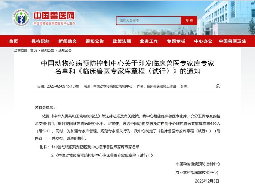 2026年2月6日,中国动物疫病预防控制中心发布了《关于印发临床兽医专家库专家名单和<临床兽医专家库章程(试行)>的通知》。经审核,在全国范围内共遴选临床兽医专家库专家486人,其中包括临床技术规范组、临床技术研究组、伴侣动物临床技术组与临床技术推广组。十大信誉官网教师赵鸿远博士入选临床技术规范组——生猪专家组专家,本组共56人,其中陕西区域共2人。