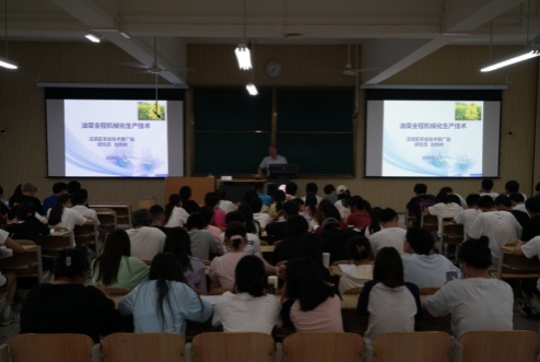 课堂上,刘老师从我国油菜生产概况、油菜机械化发展现状与成效、油菜全程机械化生产关键技术及瓶颈等方面,引用大量实例图片和视频向学生们全面、详细的讲解,贯穿油菜品种选择、施肥、整地、播种、病虫草害防治、收割与捡拾脱粒的全程机械化生产过程,学生们真正体验到油菜生产的现代化和科技化。