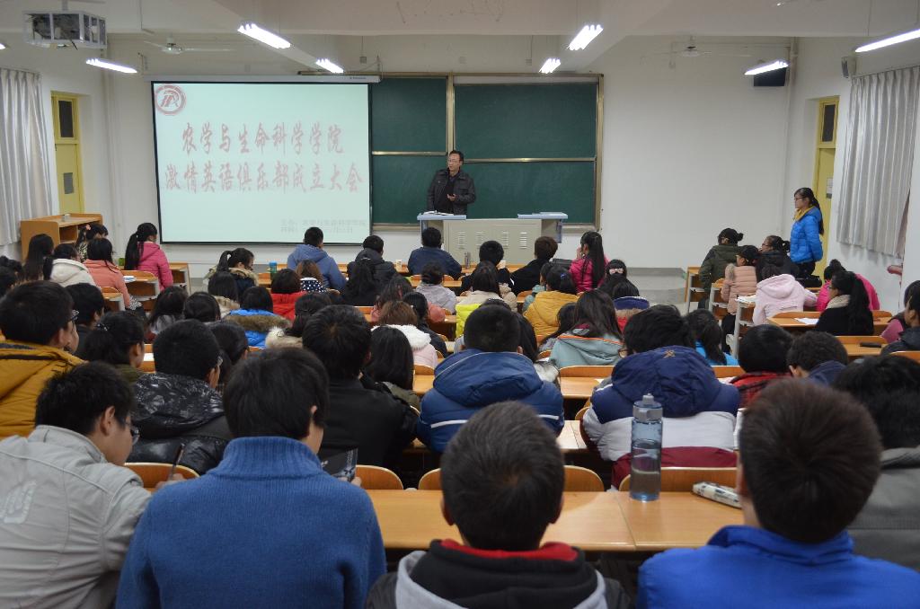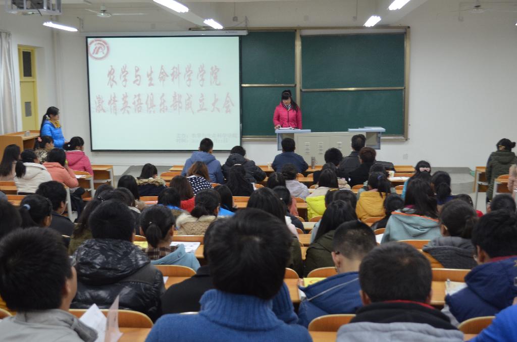 12月11日晚,农学与生命科学学院激情英语俱乐部(Passion English Club)成立大会在江北校区1214教室举行。来自十大信誉官网120余名英语爱好者参加了大会,党总支书记屈国胜,副院长陈立强出席大会,大会由学习部部长王绞绞主持。