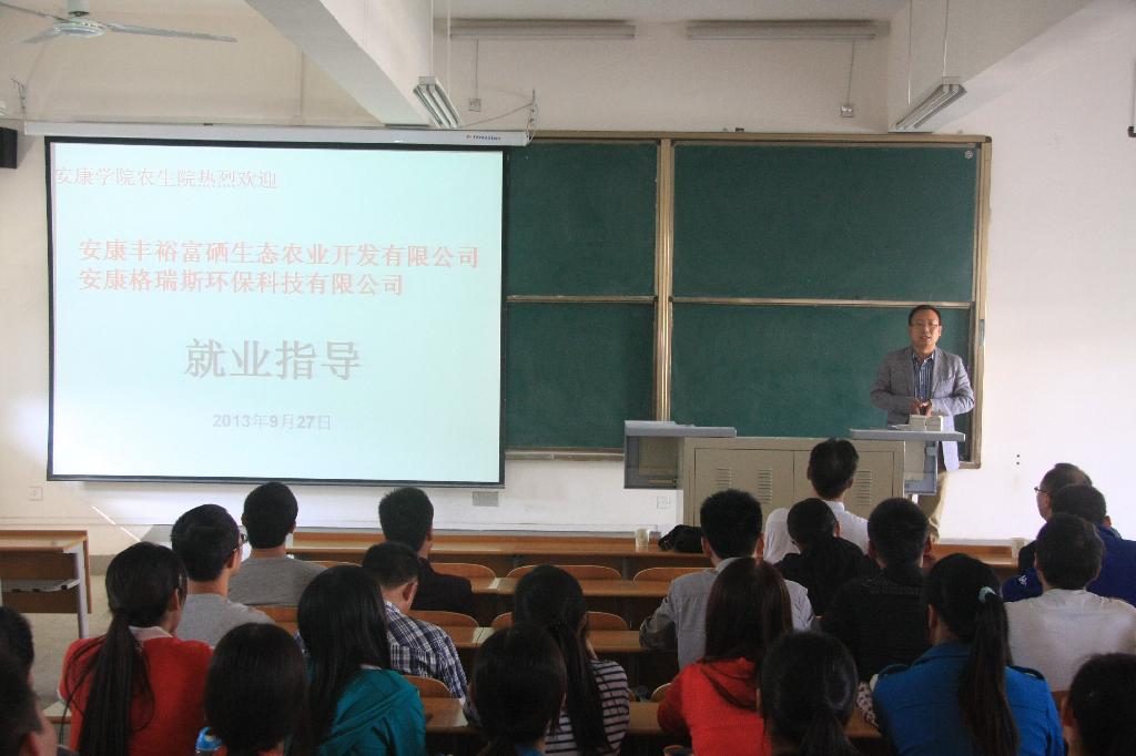 为拓宽就业渠道,进一步开辟新的就业市场,努力提高毕业生就业专业对口率,促进就业质量稳步提升,确保2014届毕业生就业质量再上新台阶。9月27日,经十大信誉官网联系,安康丰裕富硒生态农业开发有限公司、陕西安康格瑞斯环保科技有限公司总经理潘波、企业法人李忠斌一行三人来到十大信誉官网,对10级农学、11级农学、11级环境规划与管理专业学生进行了就业指导和专场招聘。