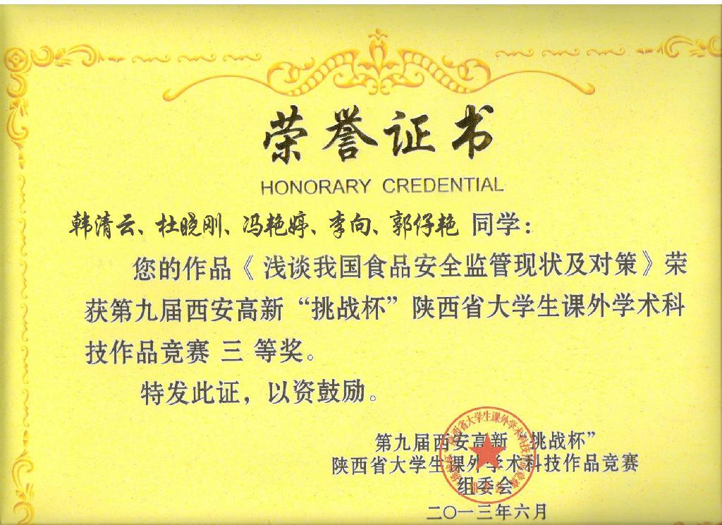 日前,2013年第九届西安高新“挑战杯”陕西省大学生课外学术科技作品竞赛评审结果揭晓,由十大信誉官网朱新鹏、杨薇老师指导的作品《浅谈我国食品安全监管现状及对策》(参赛学生11级韩清云、杜晓刚、冯艳婷、李向、郭仔艳)获得省级三等奖。