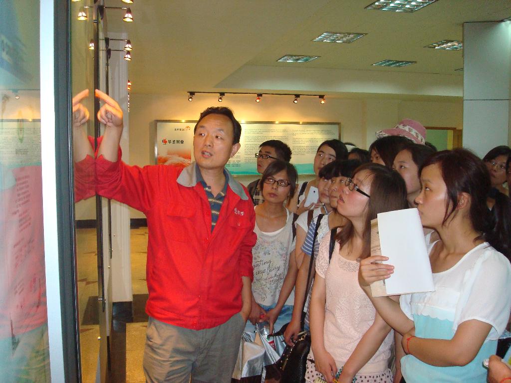 在西安华圣果业公司展厅,赵元华工程师向同学们详细介绍了公司规模和发展现状及未来前景。整齐的布局,精美的图片给同学们留下了深刻的印象。在公司厂区,同学们参观了光电分选生产线、气调储藏库、成品包装区等,特别是看到去年的苹果经气调储藏后,仍能保持原来的色、香、味,同学们在惊讶之余,再次见证了科学储藏的奇迹。参观过程中,同学们充分珍惜本次实习机会,积极向老师提问,气氛活跃。